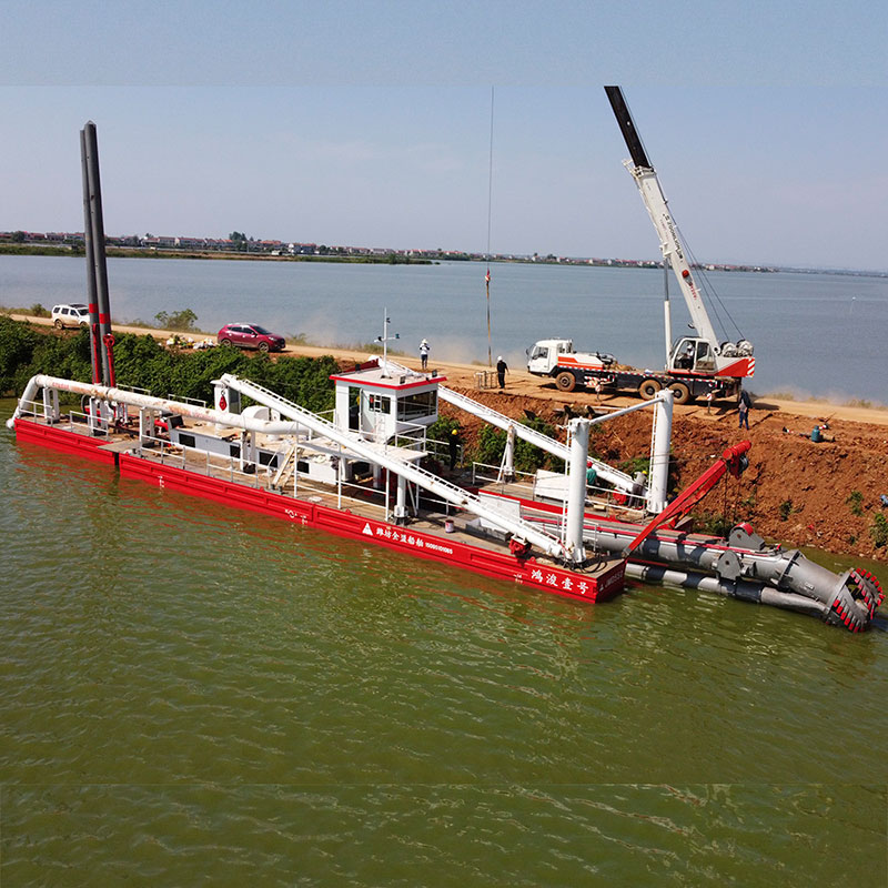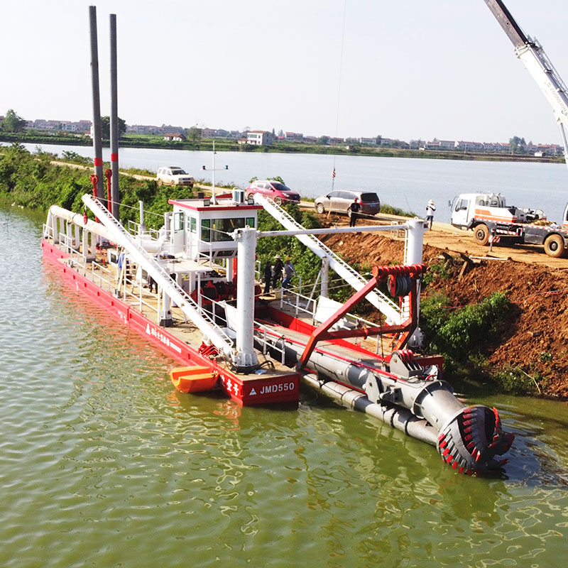 Земснаряды с речными фрезами, которые мы производим, являются самоходными или несамоходными, портативными земснарядами с речными фрезами. В корпусе используется разборная и коробчатая конструкция. Его разборный тип можно легко собрать на рабочем месте и транспортировать автомобильным, железнодорожным и контейнерным транспортом соответственно, что удобно при установке и перемещении рабочего места с одного на другое. Энергосистема может быть спроектирована как электрическая система или система привода дизельного двигателя в соответствии с требованиями клиентов. Оборудование на земснаряде для осушения реки состоит из сильфонов: траверсного устройства, подъемного устройства лестницы фрезы, буровых станков и палубного крана. Рабочий процесс заключается в следующем: режущая головка разрезает песок и ил под водой до смеси шлама, затем через землечерпалочный насос подает в трубопровод на земснаряде для осушения реки; в конце суспензия будет сброшена по трубопроводу на сушу в необходимое место.