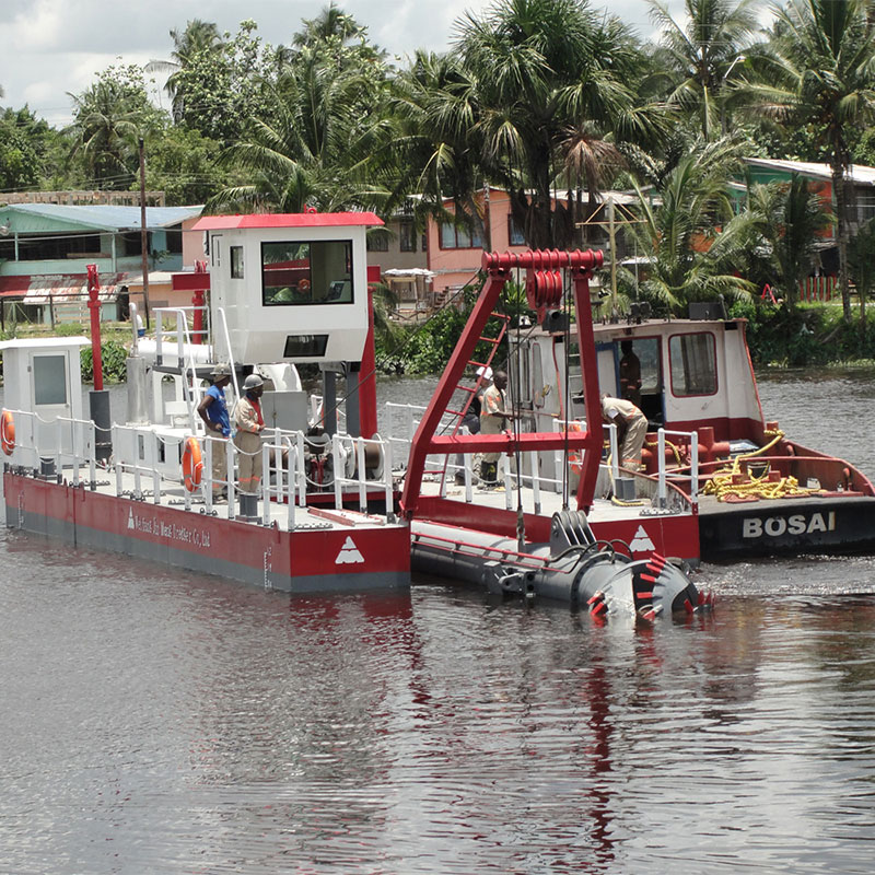 Небольшой земснаряд для выемки песка, дноуглубительные устройства приводятся в движение гидравлическим приводом с контролем концентрата. Кабина оператора является разборной, что позволяет снизить высоту земснаряда при маневрировании и позволить земснаряду легко и безопасно проходить мосты. При транспортировке земснаряда на большие расстояния из прилегающих акваторий корпус земснаряда можно демонтировать и транспортировать грузовыми автомобилями или поездами по дороге. Земснаряд можно зафиксировать с помощью анкерных стрел и буровой тележки.